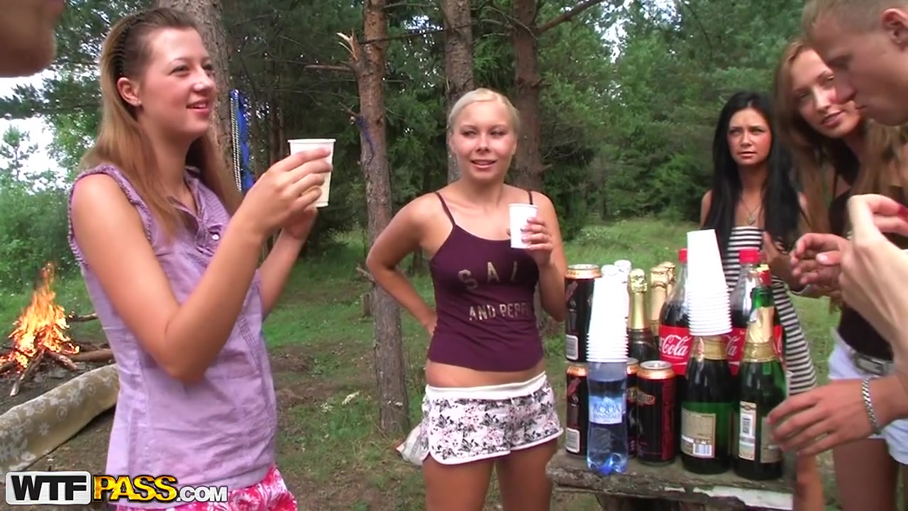 Большая кампания раскрепощенных студентов и студенток собралась на вечеринку в лесу, и после выпитого спиртного всем молодым шлюшкам захотелось промежного удовольствия. Выбрав поляну в лесу, сучки стали открывать шампанское и стараться больше выпить, чтобы быть в раскрепощенном состоянии перед групповой случкой.