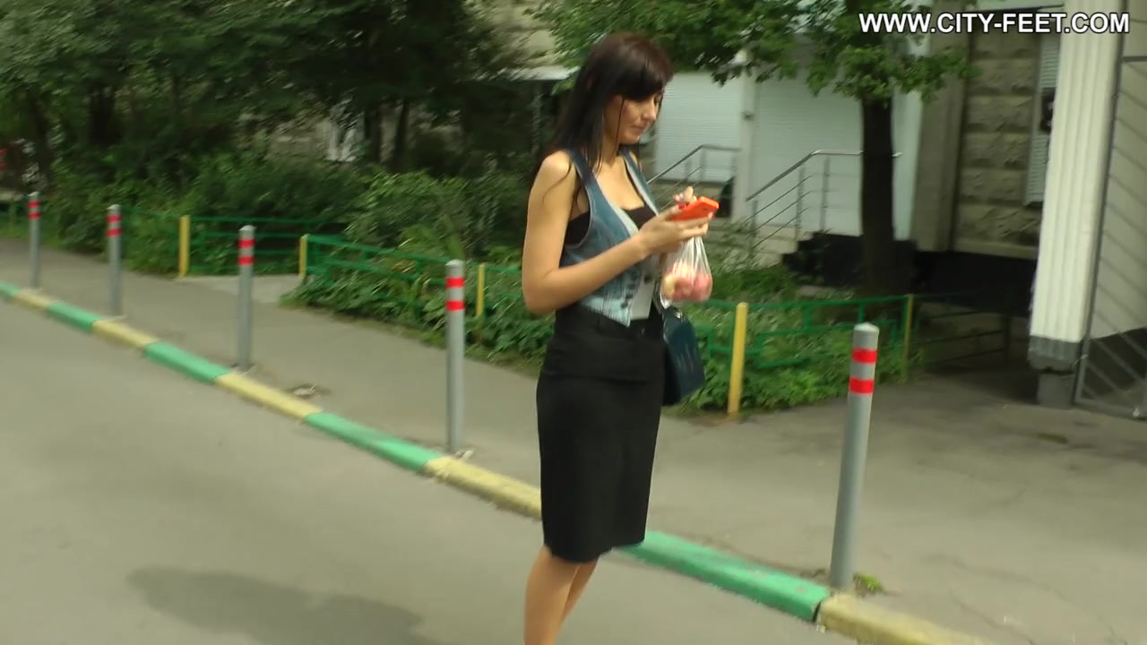 Молодая брюнетка решила почувствовать тепло городского асфальта. Она специально сегодня не одела обуви. И именно поэтому мы наблюдаем за тем, как красивая, молодая девушка возвращается с рынка домой босиком. И наблюдать за ней действительно интересно. Ведь в конце она покажет, как истоптала свои ножки, проделав сей интересный путь.